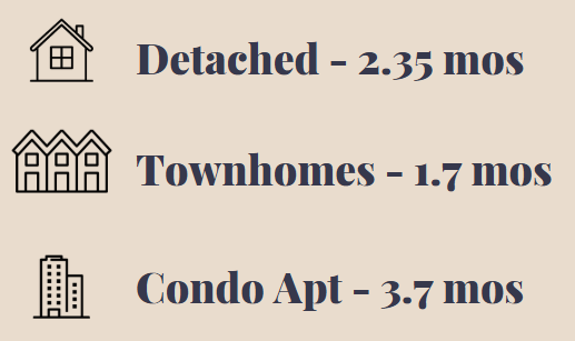 If you’re looking at a Detached home, the MOI is fairly close to that overall average, at 2.35 months. If you’re looking at a townhome property, it’s sitting at about 1.7 months, meaning homes are selling more quickly. And, if you’re looking at a condominium apartment, it’s much higher, at about 3.7 months. That is much closer to a “balanced market”.