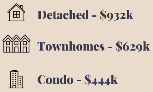 The average price for detached homes across the city was $932k, freehold townhomes were $629k, and condominiums were $444k.