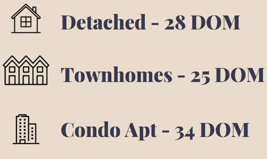 Detached homes are at 28 days. Townhomes are at an average of 25 days, and condominiums are selling in an average of 34 days, though if I break that down further, condo apartments are at 39 days while condo townhomes are at only 25 days.