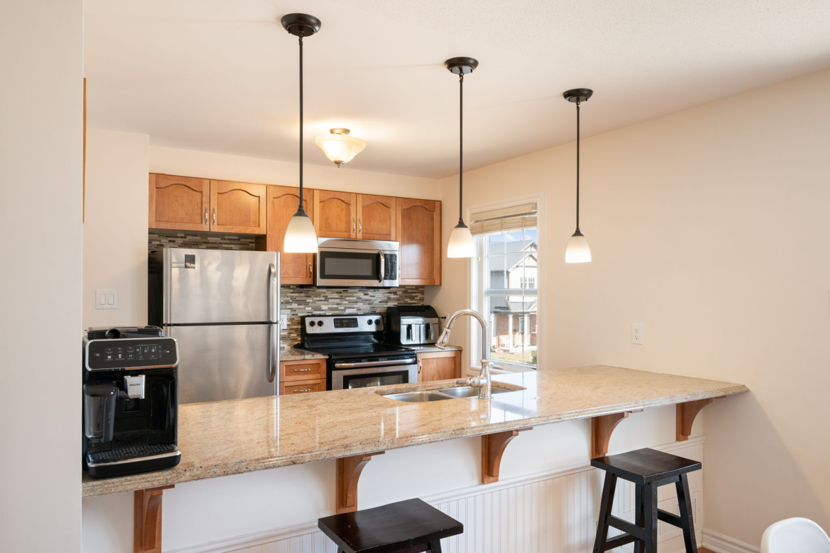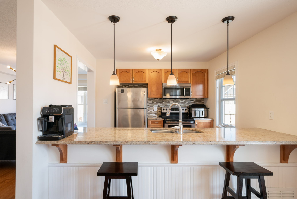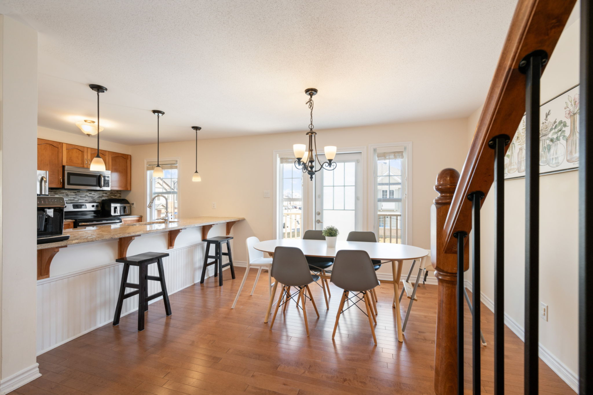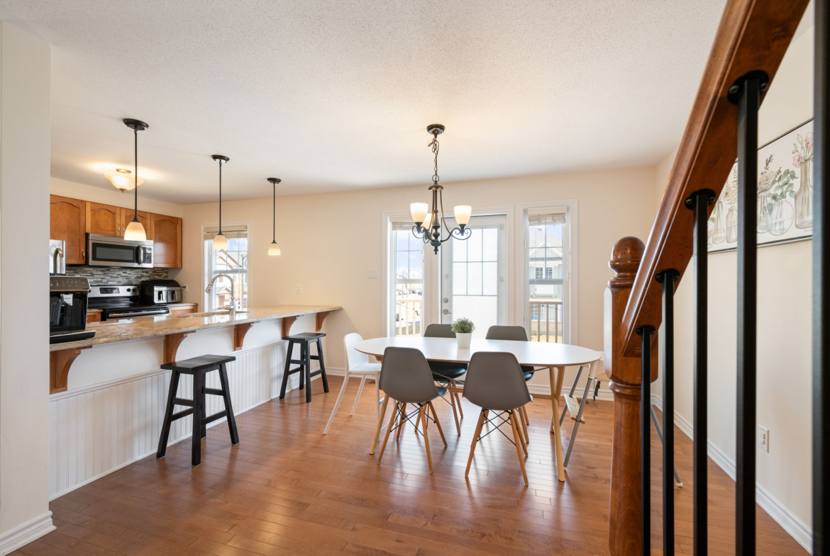 You’ll appreciate this carpet free home, with beautiful hardwood floors throughout the house (except the entry level and three bathrooms where there is tile), custom flush wooden vent covers, hardwood stairs, and upgraded railings. The kitchen has granite countertops and stainless steel appliances. This layout is exceptional, with separate areas for the dining and living rooms, which is not common in a 2 bedroom executive townhome.
